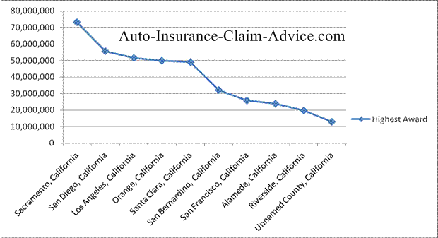 California injury settlements and jury awards show definite trends in certain counties. We studied settlement trends in the following counties and districts: Los Angeles, San Francisco, Orange, Alameda, San Diego, Riverside, San Bernardino, Santa Clara, and Sacramento. The highest jury awards was found in Sacramento for $73,063,649.
